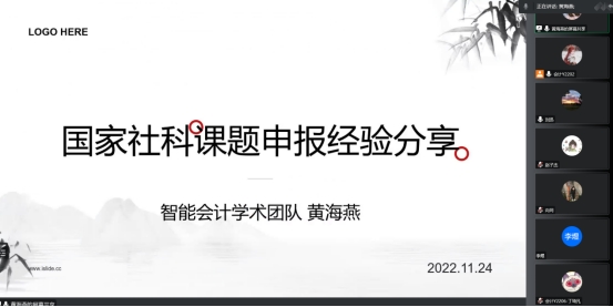 2022年11月24日下午13:00,bevictor1946韦德官网智能会计理论与实务学术团队在腾讯会议开展了学术交流活动,团队成员黄海燕博士做了“国家社科课题申报经验分享”的主题报告,团队全体成员参会,活动由团队负责人刘迅教授主持。