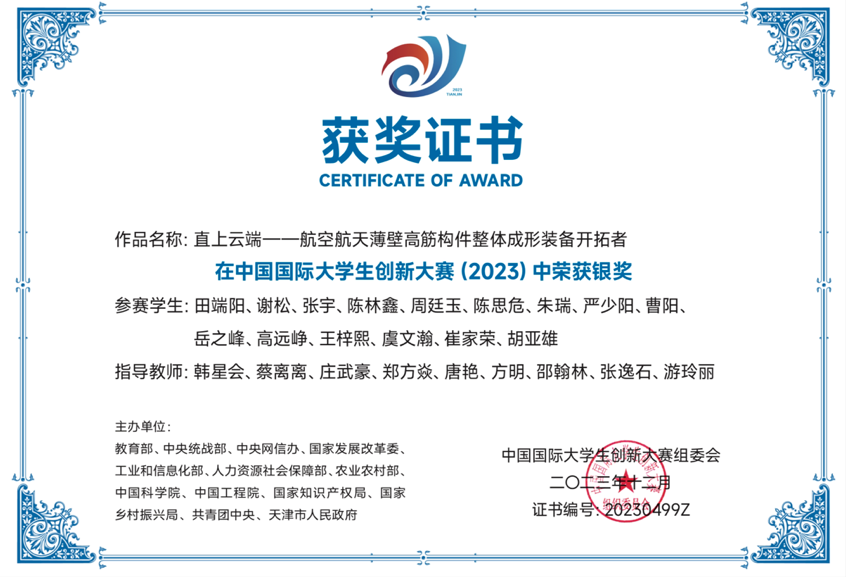 直上云端——航空航天薄壁高筋构建整体成型装备开拓者 | 韩星会、蔡离离、庄武豪、郑方焱、唐艳(bevictor1946韦德官网)、方明、邵翰林、张逸石、游玲丽 | 田端阳、谢松、张宇、陈林鑫、周廷玉、陈思危、朱瑞、严少阳、曹阳、岳之峰、高远峥(bevictor1946韦德官网)、王梓熙、虞文瀚、崔家荣、胡亚雄 | 银奖 |
