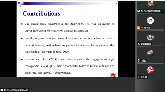 会上,团队成员Bilal博士分享了碳排放披露与中国高污染工业中的管理机会主义、管理者个人特征的关键作用等有关的主题内容。阐述了此主题的研究动机、研究逻辑与研究贡献。通过对碳披露排放中管理者的信息数据分析和对2790家中国高污染企业的年度观察样本研究,得出了三点结论:第一,在中国背景下,盈利操纵与碳披露呈负相关;第二,CEO特征与碳排放披露存在正相关;第三,盈余管理对碳披露的负面影响取决于CEO的特征。