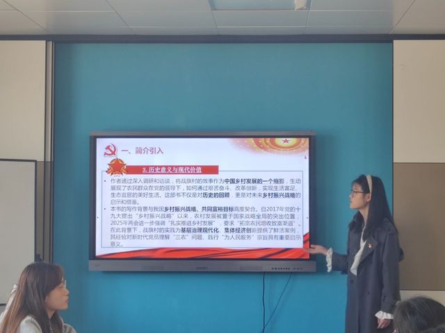 在分享会上,三名党员结合个人学习、实习经历,依次分享读书感悟。研究生党员李鑫淼通过聚焦四川省战旗村55年发展历程,以“一二三四”框架解析村庄变迁,重点呈现“敢为人先、实干创新、共享共富”的战旗精神。本科生党员郭怡通过村支书李志刚抵押修路、村民张秀兰思想转变等案例,感悟到“小人物推动大变革”的力量,并引申至员工党员如何以“挖井精神”解决学习难题。本科生党员蔡雨杭结合学习感悟,提到会计学子可通过财务透明化、绿色核算助力乡村振兴,呼吁青年党员以专业能力服务基层。