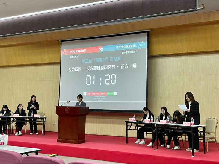 本次决赛正反双方分别为财管辩论队与会院辩论队,比赛的题目为“中华文化浪漫在繁/简”。比赛过程中反方一辩陈思茹做出了精彩立论,反方二辩洪雯钧针对对方的事例及论点进行了驳论,反方三辩徐子蕴通过盘问推动我方论点,并在后续发动了奇袭(在每个大环节结束后可选择发动质询或申论),最后,反方四辩吕丹芬通过结辩完善了我方论述。整场比赛中,公司辩论队在前期略显紧张,但在后期逐渐进入状态,把握住了比赛的节奏,打出了自己的观点。