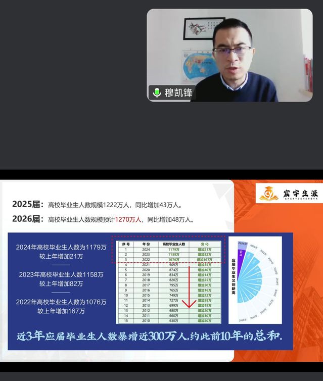 穆凯锋以自身职业发展轨迹告诉同学们“职业发展是一个长期探索的螺旋上升的过程”。他分析当前的国际局势、经济社会和毕业生人数等宏观形势,并提醒同学们面临着绿色经济、银发经济、人工智能新的机遇。他建议,同学们要聚焦就业方向、提升就业技能、坚定就业信心、正视就业形势,关注西部计划、三支一扶等政策性就业,关注应届生求职网、高校人才网,畅通就业信息渠道。