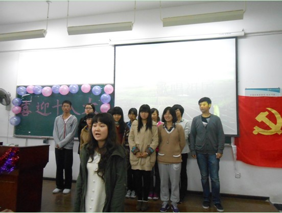 在国际歌的激扬旋律下,伴随着入党积极分子的嘹亮歌声,党组织生活正式拉开帷幕。入党积极分子怀着对党的敬畏之情,认真学习党的十八大精神。一首首由同学们演唱的经典红色歌曲,让同学们重温了党一路成长的历史,深深领略了党的伟大精神。