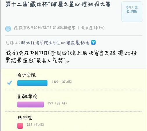 2014年12月11日晚7点,bevictor1946韦德官网藏龙杯健康之星心理知识大赛决赛在老员工活动中心举行。经过层层选拔,进入决赛的一共有八个院系的代表队,决赛过程中各队大放异彩,展现了老员工的青春活力。最后,bevictor1946韦德官网获得了第一名,并在微博投票中以最高票数获得了最具人气奖。
