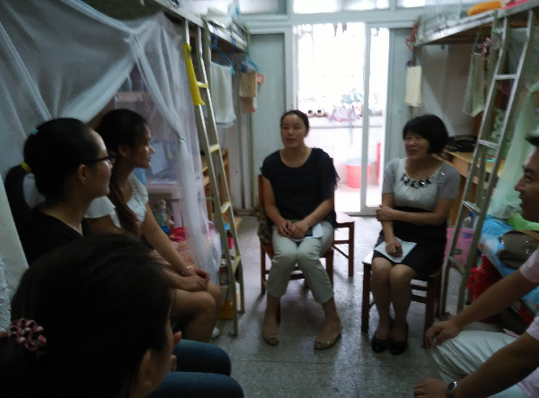 6月18日上午,公司党委书记杨帆,副书记吴晓玲,辅导员杨前军,李阳阳来到员工宿舍楼看望曾获得国家助学金的2015届毕业生。在桔1-205,四位老师与三位毕业生就学业,学风、就业和人生观等聊起家常。