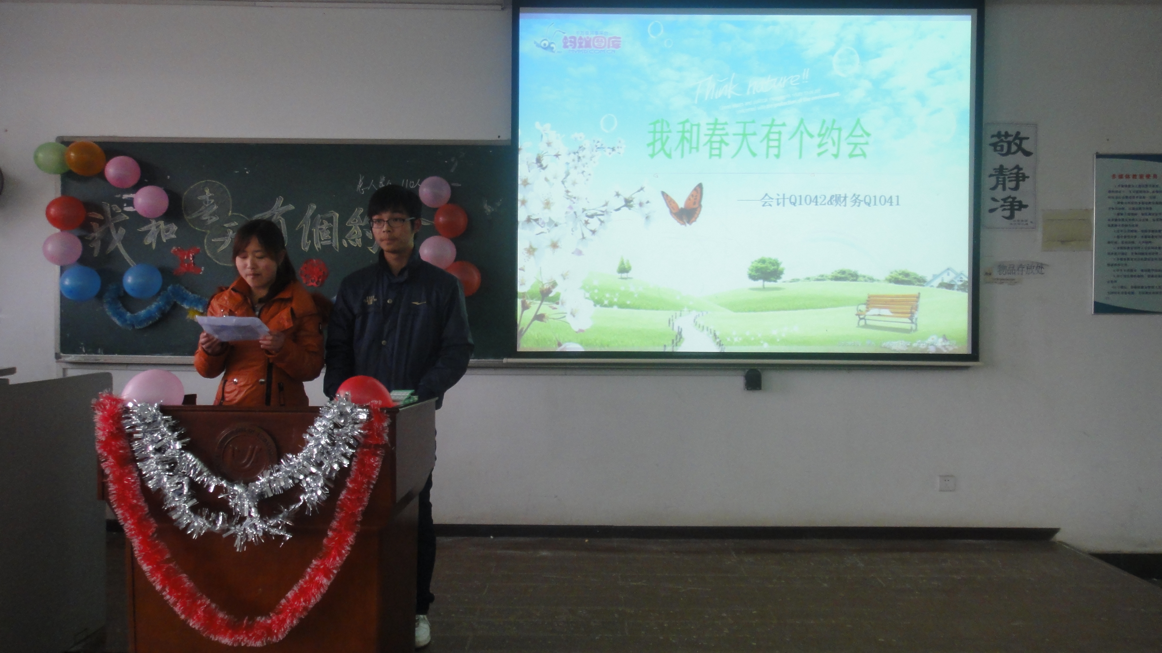 其中,由财务Q1041班、会计1042班共同组织的活动丰富多彩,别具创意。他们以“三月”为主轴,将三月份各种具有纪念意义的节日贯穿其中,使春之温暖从物质层面上升到了精神层面。诗朗诵——《我和春天有个约会》紧扣活动主题,字里行间流露出同学们对春天来临的欣喜。而后,一段由财务Q1041班同学拍摄的视频让大家重温了
