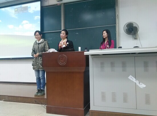 随后,讲师团队邀请一位女生参与试妆,实地传授化妆小技巧,与大家分享美丽,分享蜕变。傅女士又向大家展示站、坐、行和蹲的优雅技巧,希望大家由内而外的提升人格魅力,她对积极参与互动,勇于上台展现自己的同学送上了小礼品。最后,黄晗老师做总结讲话,对同学们提出寄语。