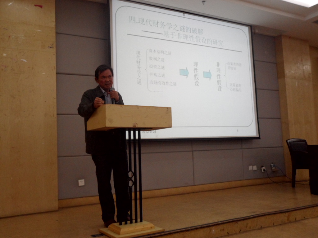 张兆国教授首先提出现代财务学堪称“帝国”的概念,接着对现代财务学进行了定位。张教授强调:“由于财务学与经济学之间有一定的相容性,财务学的发展深受经济学的影响,且对经济学的发展做出了巨大贡献,所以现代财务学是经济学的分支。”张兆国教授还解释了现代财务学的概念结构,罗列了现代财务学的基本理论。在谈到现代财务之谜的破解时,张教授指出要基于非理性假设的研究,要考虑决策者的背景特征和决策者的心理偏差等条件。