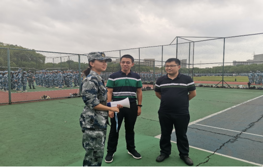 王友刚书记与在场的免训员工进行了交流,告诉员工要做好场边的后勤保障工作,积极为同学们和教官们服务。随后在场边观看各方阵的训练情况,并向公司退伍员工教官金文琪了解训练的基本流程和期间遇到的困难。金文琪教官表示,同学们都很有毅力,天气炎热但同学们都咬牙坚持,训练过程比较顺利。